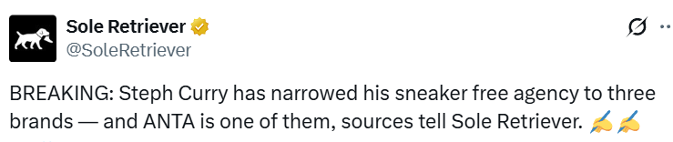 安踏全力追求库里这样的顶级商业价值球星并不意外,但他们可能击败哪些竞争对手,或许会让你大吃一惊。Sole Retriever表示,暂时不能透露另外两家品牌是谁。
